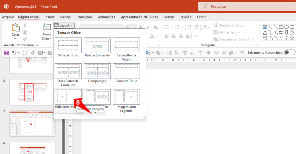 Passo 8: Para aplicar o espaço reservado de imagem que você criou, clique na aba “Layout” e escolha o slide com o modelo que você definiu.