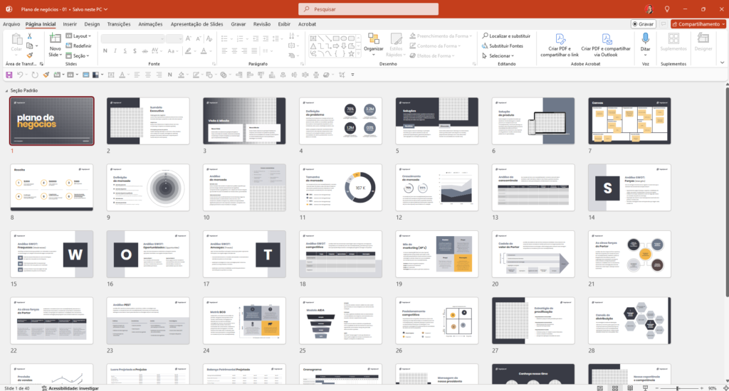 O template de plano de negócios pronto para PowerPoint oferece toda a estrutura que você precisa, de forma totalmente editável, para que você possa personalizar conforme o seu negócio.