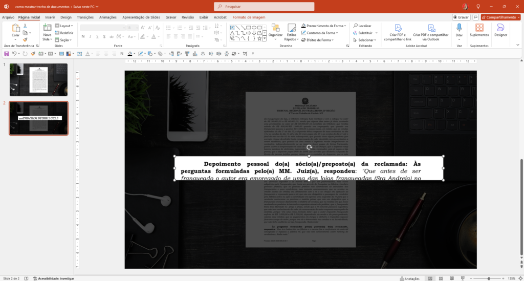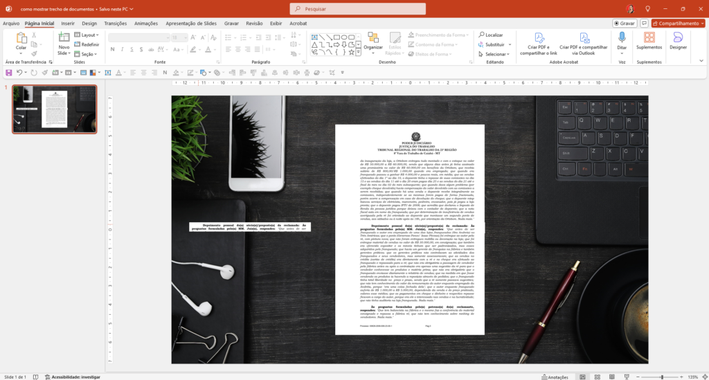 Pronto! Agora, ao passar para o segundo slide, o público verá um destaque no trecho do documento, o que ajuda a direcionar a atenção para a informação relevante.