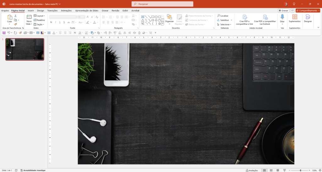 1- Escolha uma Imagem de Fundo: Comece buscando uma imagem que imite uma mesa, o que cria um visual mais realista e imersivo. Insira essa imagem como fundo do slide.